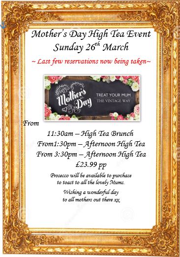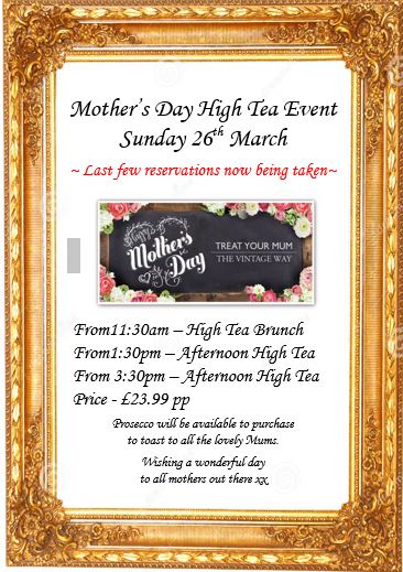 Mothering Sunday – special event Posted on March 2, 2017 by Brewery Tea Rooms Reply Our Mother’s Day special is booking fast – ring 01438 861930 to secure your booking. Happy Mother’s Day – Sarah and the team x Share this: Click to share on Facebook (Opens in new window) Facebook Click to share on X (Opens in new window) X Click to share on Pinterest (Opens in new window) Pinterest Click to share on WhatsApp (Opens in new window) WhatsApp Like Loading...