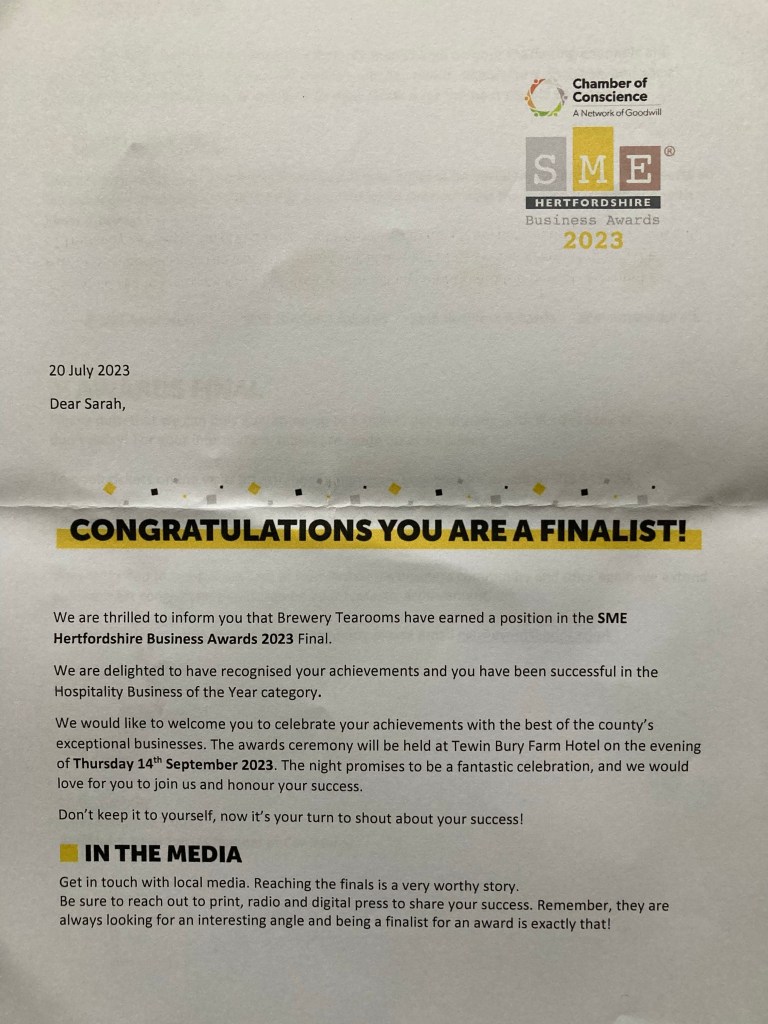 We’re finalists in SME Herts Small Business Awards, recognising our achievements & success in the Hospitality Business.