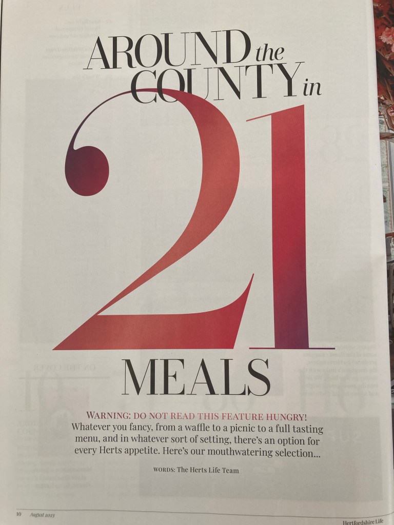 We feel very honoured to be featured in August’s edition of Hertfordshire Life Magazine, in their ‘Around the County in 21 Meals’ article. Xx